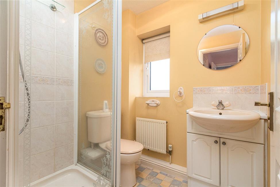 Comprising low level WC, wash hand basin with mixer tap and storage cabinet below, shower cubicle with an electric shower, ceramic wall tiling to wet areas, opaque window to the front, radiator, vinyl floor covering.