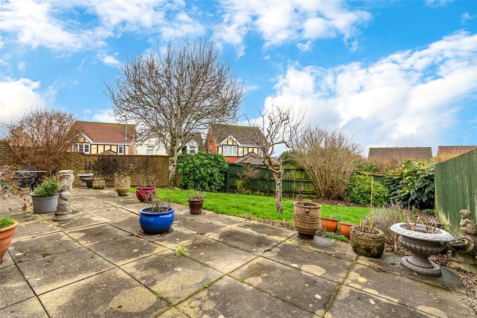 Large paved patio area leading down onto a section of lawn, enclosed with timber lap fencing and brick walling, established boarders with trees and shrubs, access to a side gate which leads to the front driveway.
