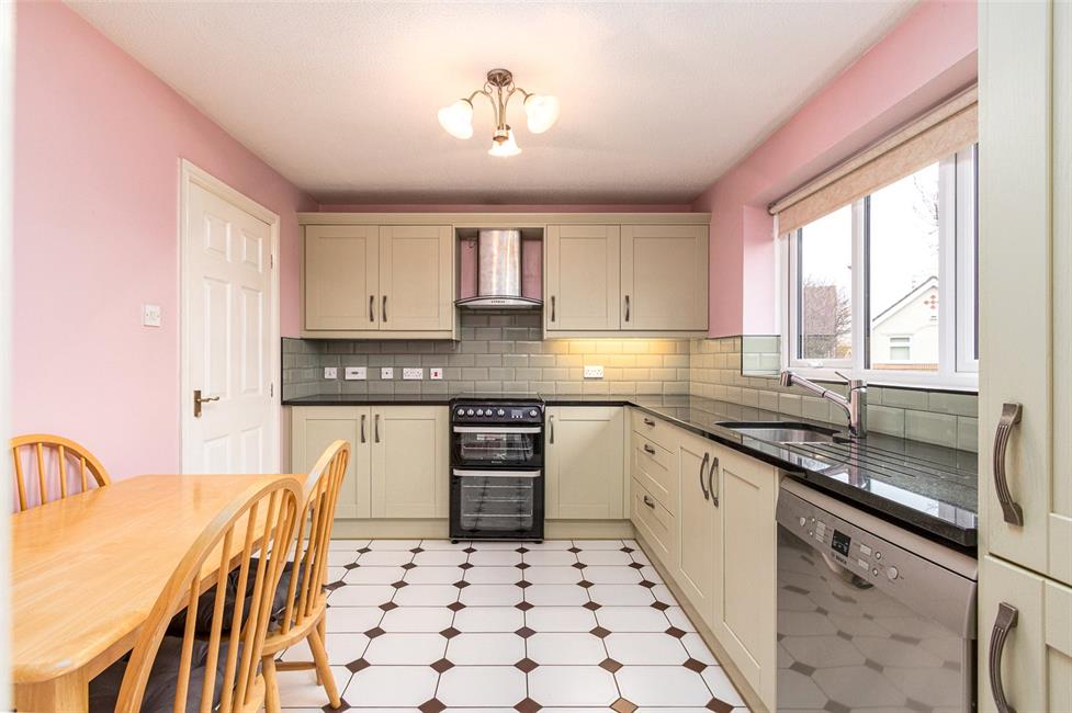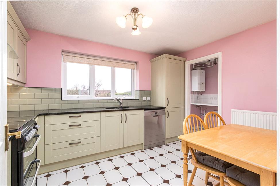 Appointed along two sides in shaker style fronts beneath quartz worktop surfaces, inset under-mounted 1.5 bowl stainless steel sink with worktop drainer grooves and mixer tap, space for slot-in cooker with stainless steel cook hood, integrated fridge and freezer, space for dishwasher, matching range of eye level units, stylish metro brick wall tiling to worktops surround, tiled flooring, window overlooking the lawned rear garden, radiator, space for breakfast table.