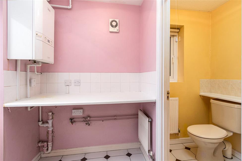 Space and plumbing for an automatic washing machine, radiator, worktop surface with tiled surround, wall mounted gas central heating boiler, UPVC glazed door to the rear garden, door to cloakroom.