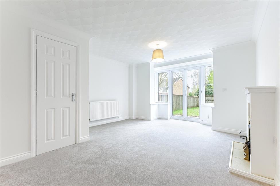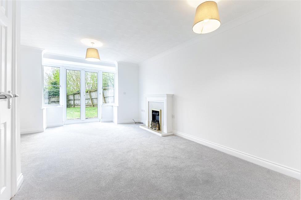 Square bay with windows and uPVC French doors leading out onto the lawned rear