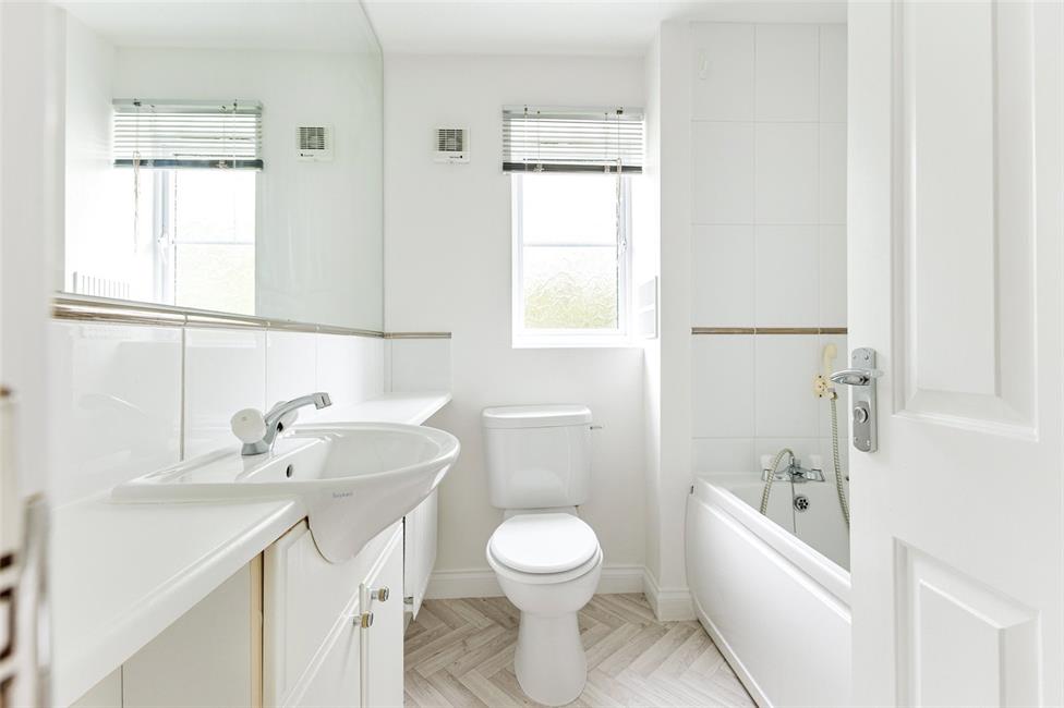 Low level WC, wash hand basin with cabinets below and tiled splashbacks, radiator,