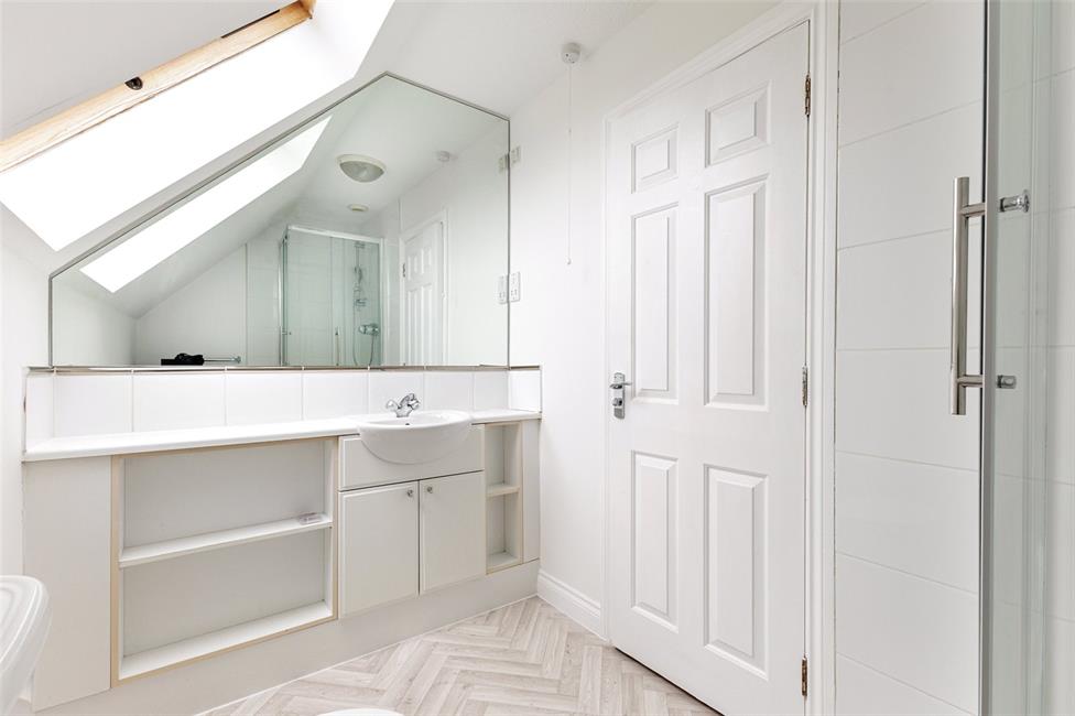 below and mirrored wall above, shower cubicle with thermostatic shower, Velux