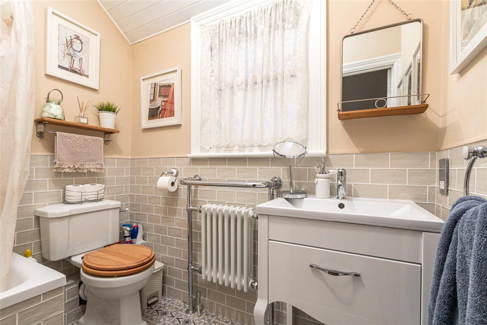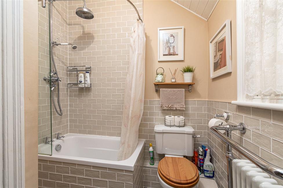 Opaque sash window to the side. A beautifully appoint and recently refurbished bathroom suite with a space saving tiled panelled bath with a fixed glazed panel as well as a fixed shower curtain rail, thermostatic shower control with flexible handle and rainfall style fixed shower head, ceramic wall tiling, close coupled WC, sunken wash hand basin with storage below, traditional style taps, toilet roll holder and towel hooks, ceramic floor tiling, further wall tiling to half weight, feature traditional radiator with heated chrome towel rail, shaver point.