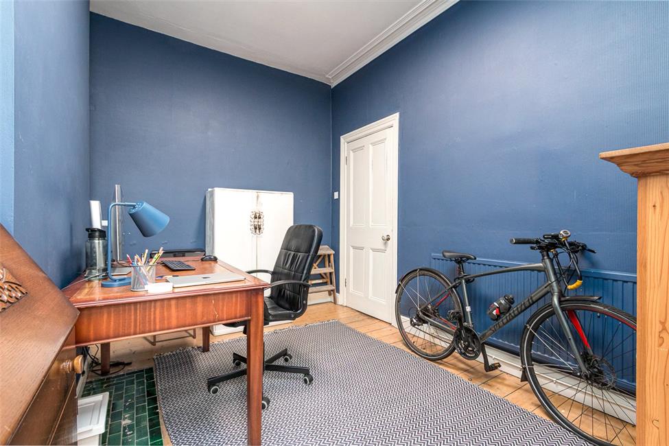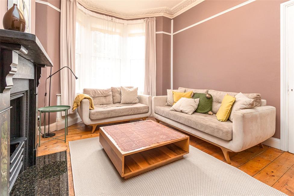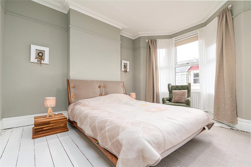 Window to the front with a further feature double glazed bay window overlooking the quiet cul-de-sac, double radiator, exposed floor boards, period coved ceiling, dado rail and high level skirting boards.