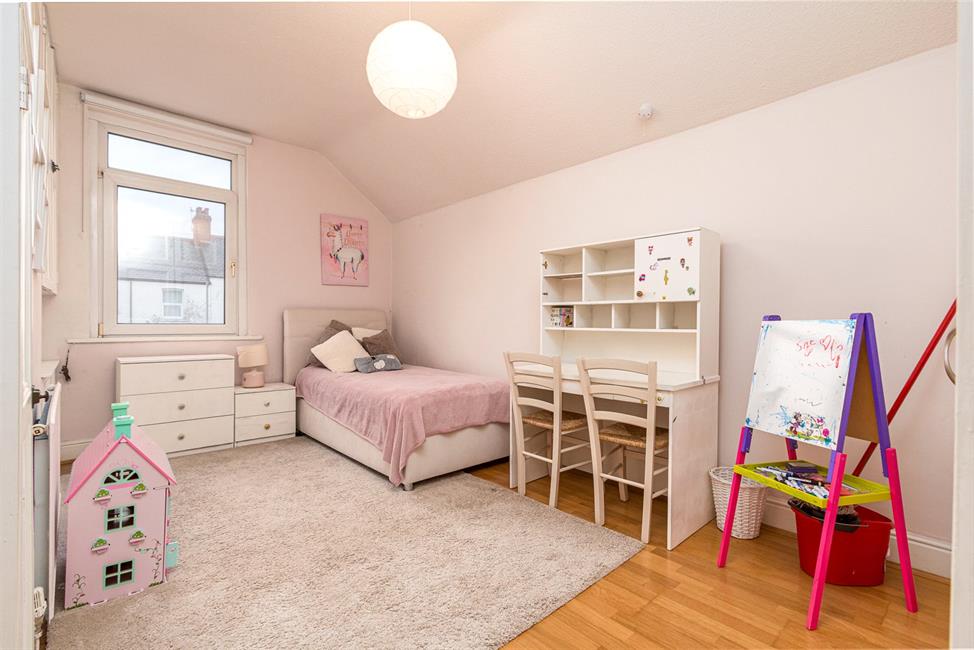 A sizable double bedroom overlooking the rear garden, radiator, laminate flooring, built-in cupboards comprising of double wardrobe with hanging rail and overhead storage a further two single wardrobes with overhead storage and wall mounted double cupboard with storage beneath, TV point.