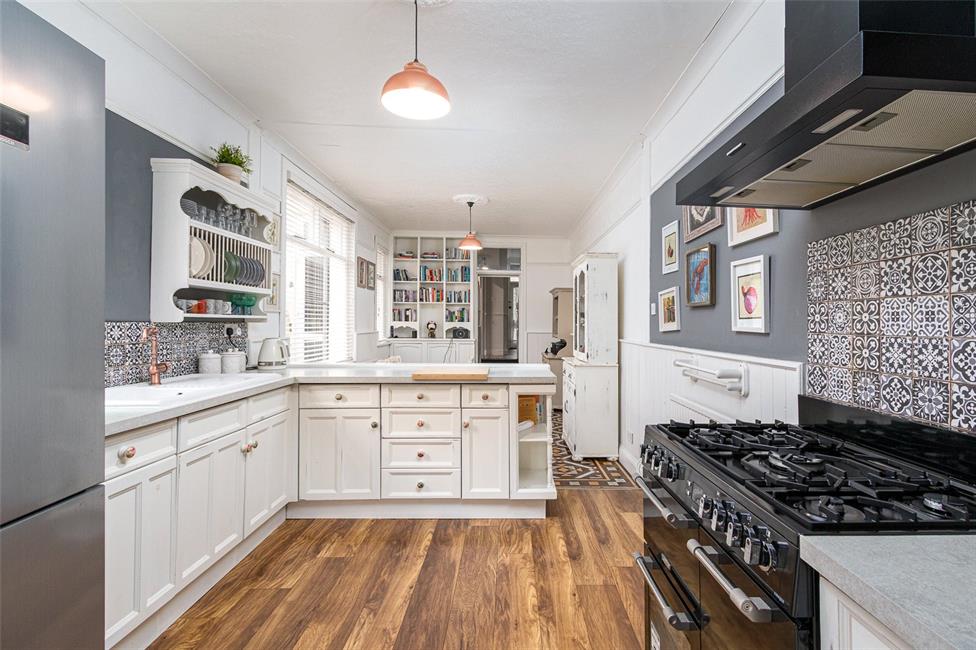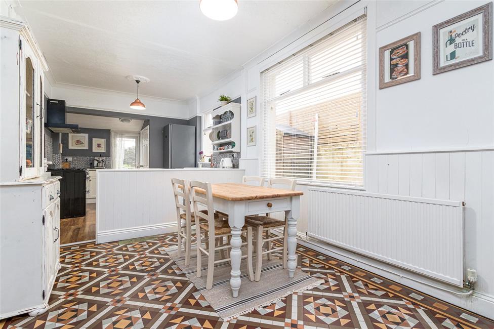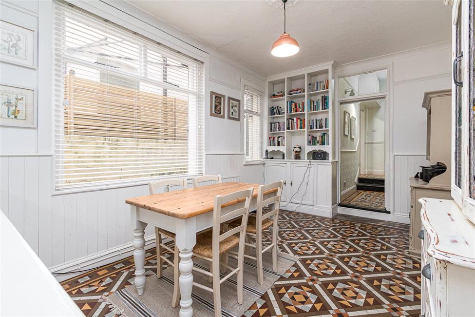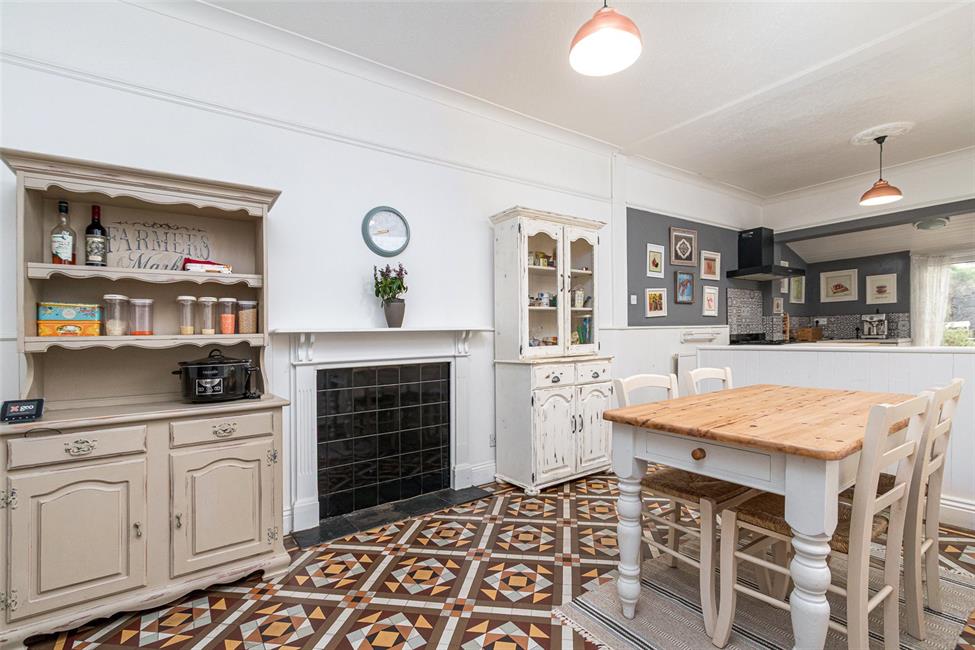 A superb large bright area with three windows to the side and a UPVC double glazed door giving access to the rear garden, white fronted kitchen, with timber doors appointed along three sides, comprising of display unit with plate racks and base units with drawers and worktops over, inset white ceramic sink with antique style mixer tap, range style cooker with five burner gas hob and cooker hood above and multiple ovens below, ceramic wall tiling to work surface surround, double cupboard with window to the rear, wall mounted gas central heating boiler, plumbing and space for washing machine and space for side by side dryer with power. Kitchen area is laminate flooring and dining area has period tiled patterned floor, a fire place surround (not functioning), original dresser and wall tiling to half height, radiator, main broadband feed.