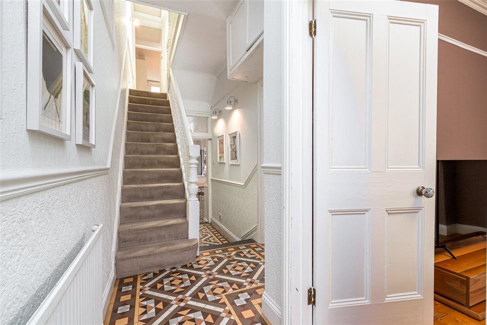 Easy rising spindle staircase to first floor landing, split level with a couple of steps down to a further hallway and entry to the kitchen/diner, door to further reception rooms, high level meter cupboard, period features include tile patterned floor, picture rail, dado rail and skirting boards, under stairs recess.