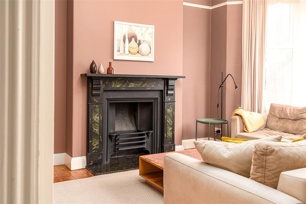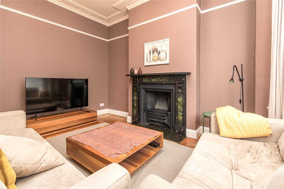 UPVC double glazed bay window overlooking the front courtyard and quiet cul-de-sac, with wood panelling below, radiator, feature fireplace with surround on a granite type hearth, inset grate (not functioning), period ornate coved ceiling with a picture rail and high level skirting boards, exposed and stained floor boards, TV point.
