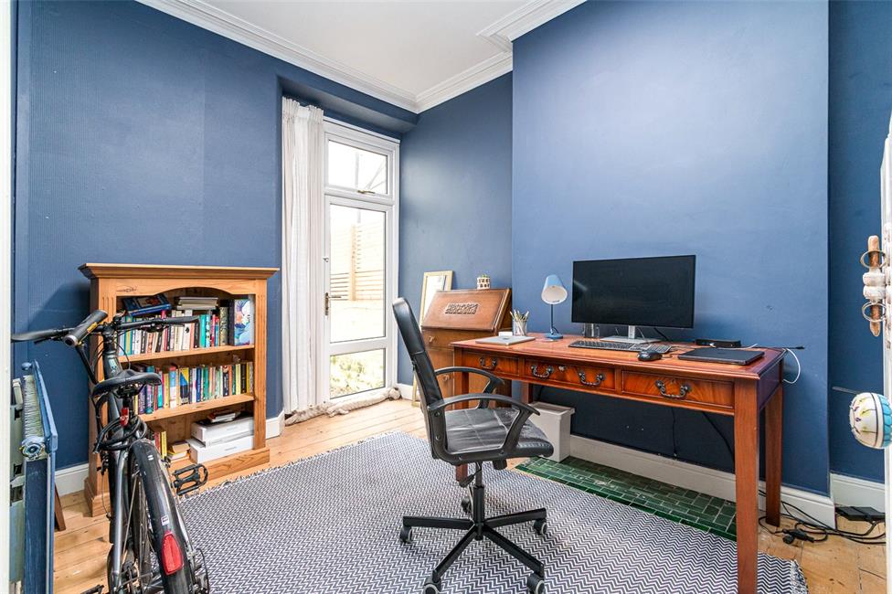 UPVC double glazed door and full height window to the side return and the garden, radiator, period coved ceiling, high level skirting boards and exposed floor boards.