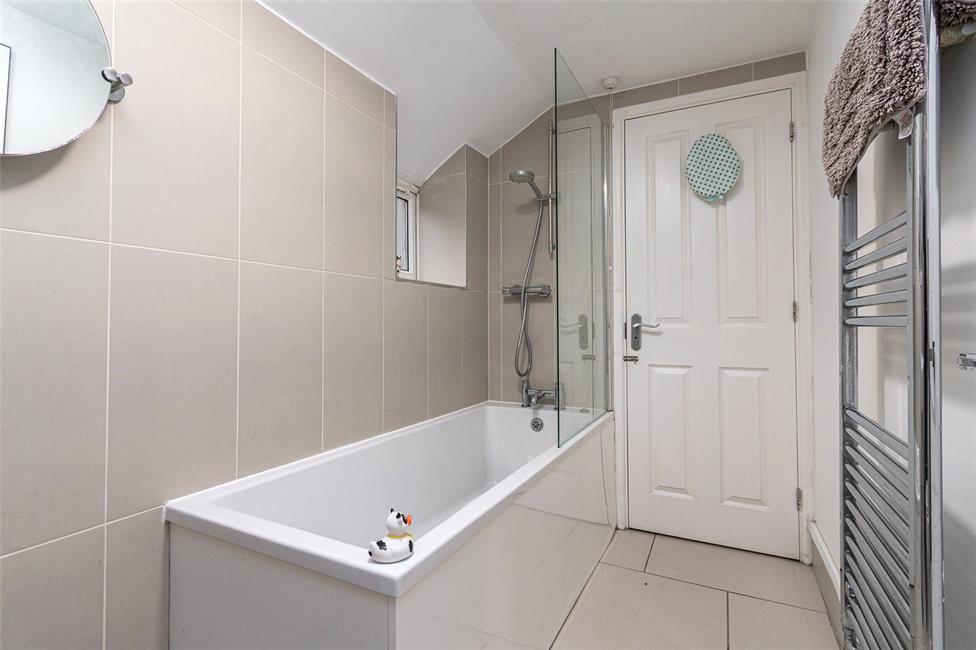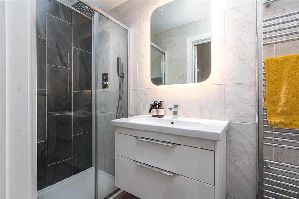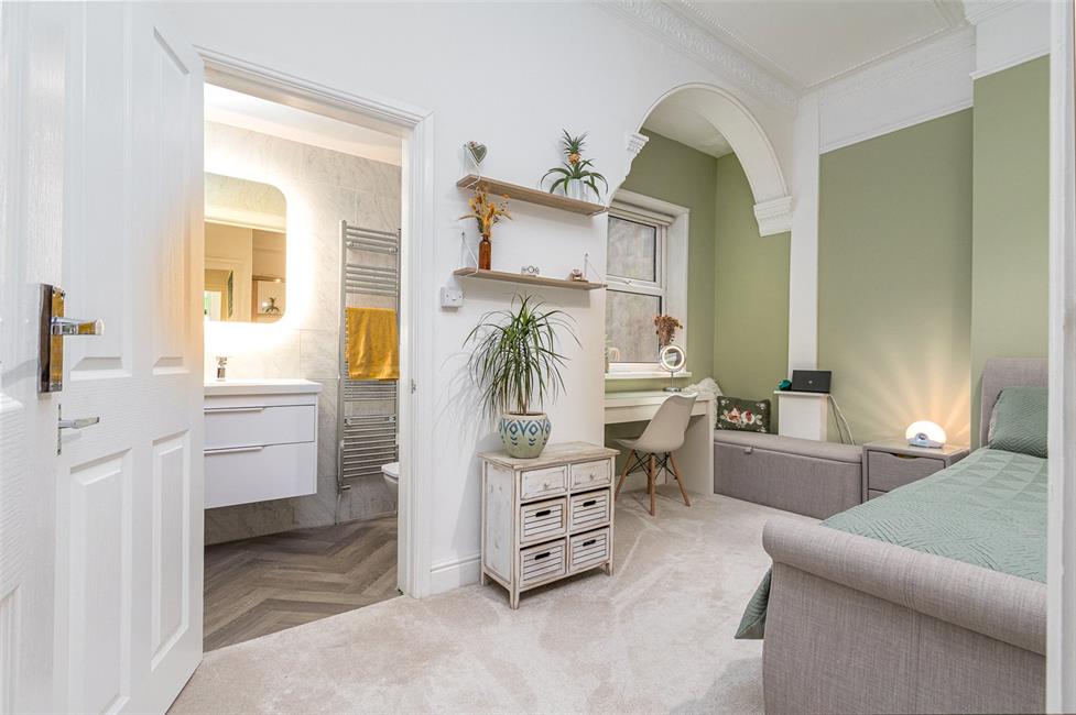 Positioned just off the kitchen with connecting door to family bathroom. Stylish bathroom comprising panelled bath, glazed shower screen, shower, pedestal wash hand basin, low level WC. Ceramic floor tiling with border, attractive wall tiling to two sides, obscure double glazed windows to side.