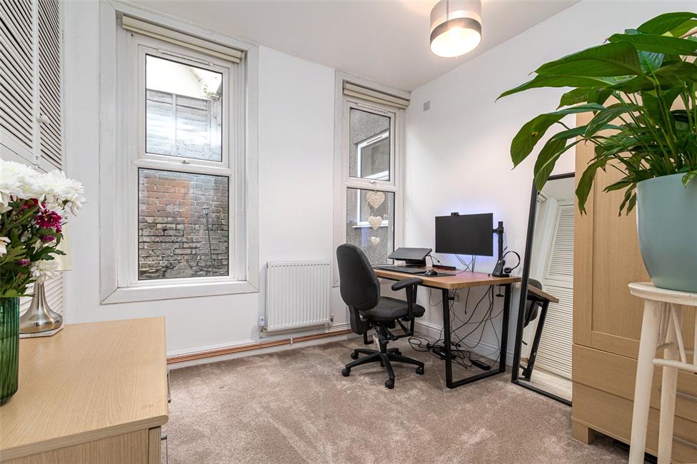 Two double glazed windows to side, built-in lourve fronted cupboards, panelled radiator.