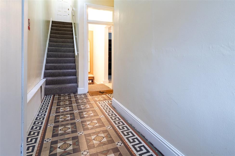 Approached by a panelled front door with obscure window inserts to upper part, fanlight above, leading onto a deep central hallway, decorative tiled flooring with border.