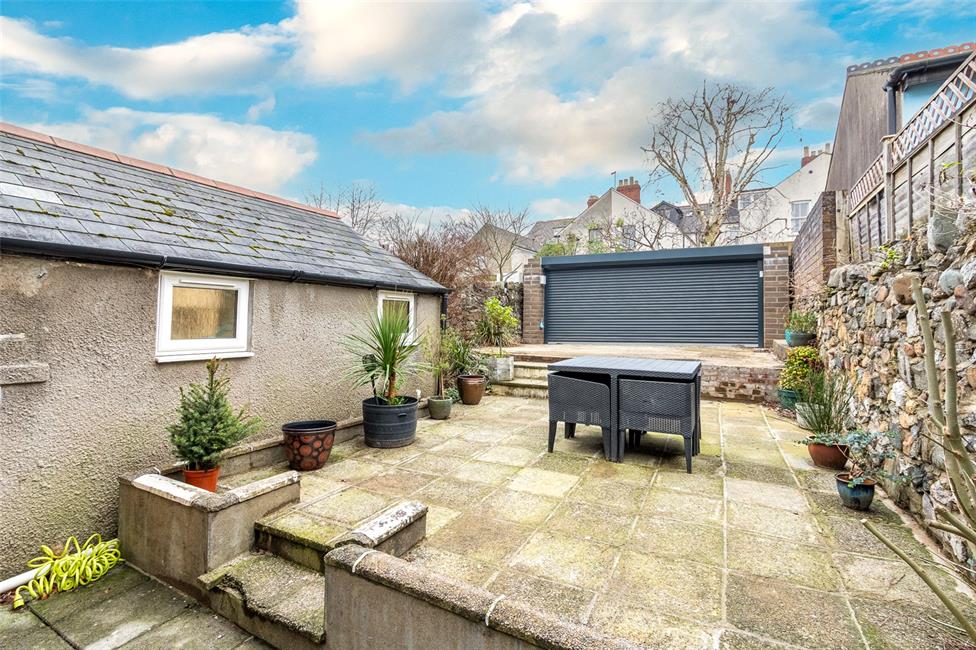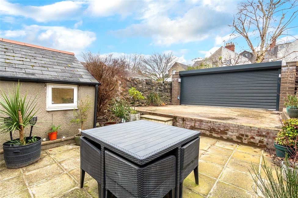 Attractive paved patio area leading onto a double width concrete hard standing with roller door accessing the lane.