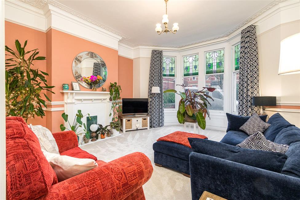 Spacious elegant main reception, feature sash cord windows with coloured leaded light windows above overlooking the entrance approach, tall decorative ceiling with cornice, matching picture and plaster borders, feature fire surround, gas point, panelled radiator.