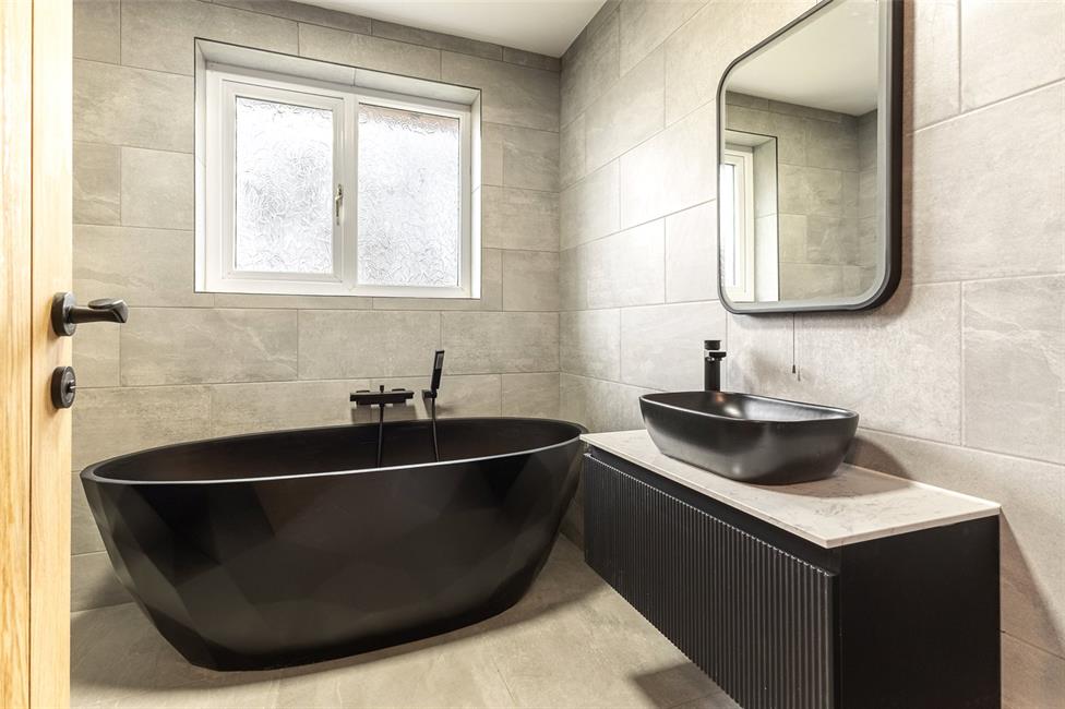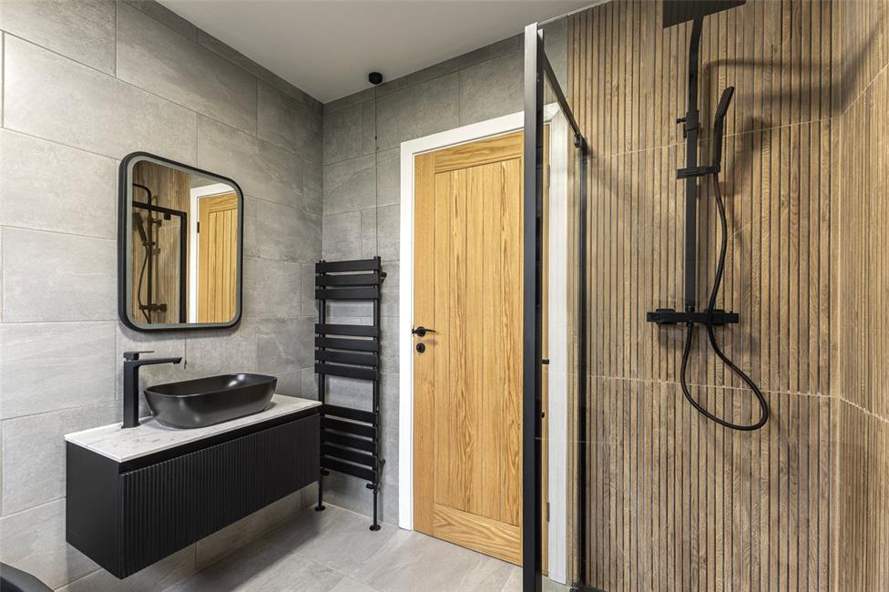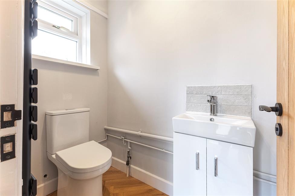 Low level WC, porcelain wash basin, tiled splashback, heated towel rail, quality