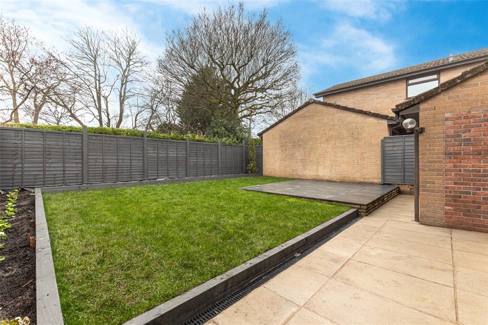 an open and sunny aspect, area of lawn with raised flower bed borders, enclosed by