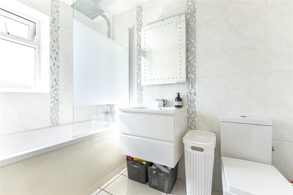 Comprising low level WC with push button cistern, wash hand basin with mixer tap and storage below, Bluetooth mirror with LED lighting and heated demister pads, panelled bath with glazed shower screen and a rainfall style shower and jets. Comprehensively tiled walls and flooring, opaque window to the rear, chrome heated towel rail.