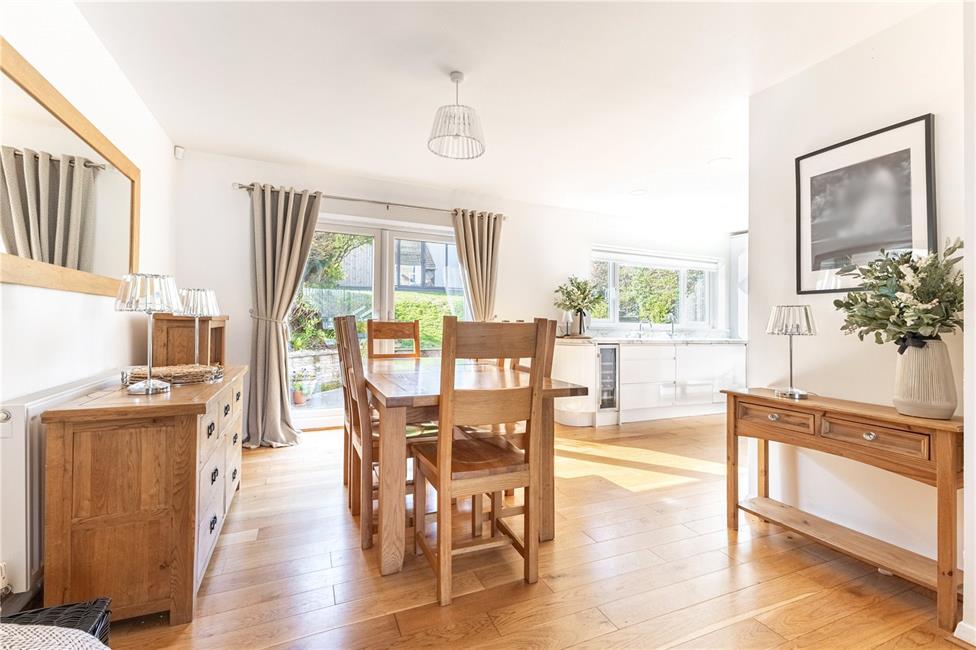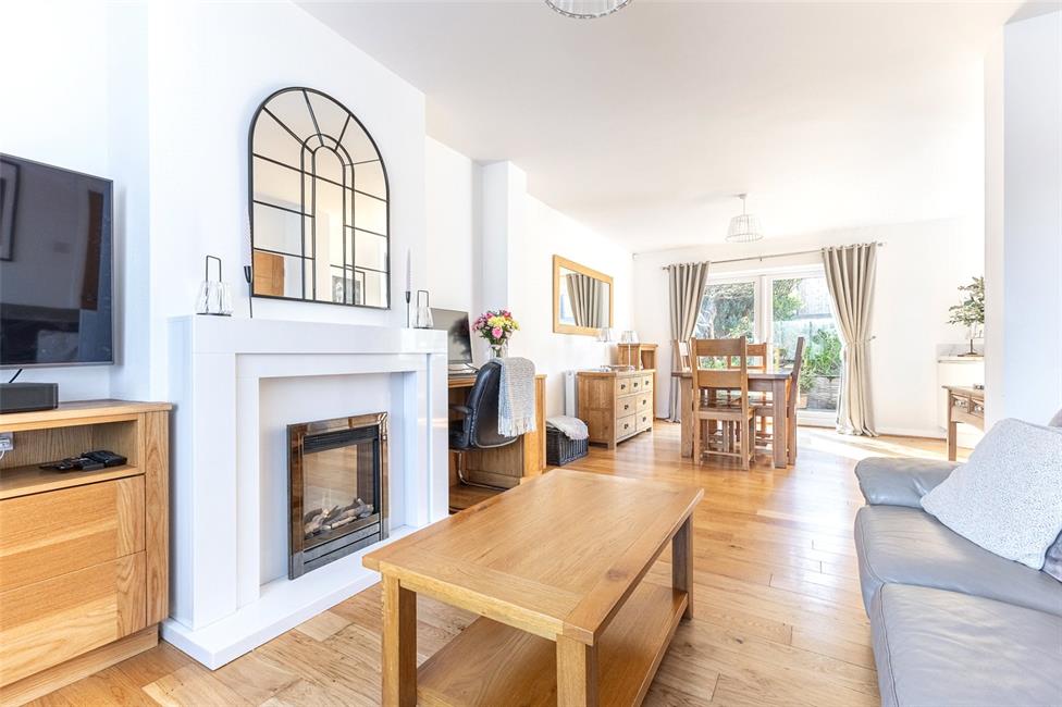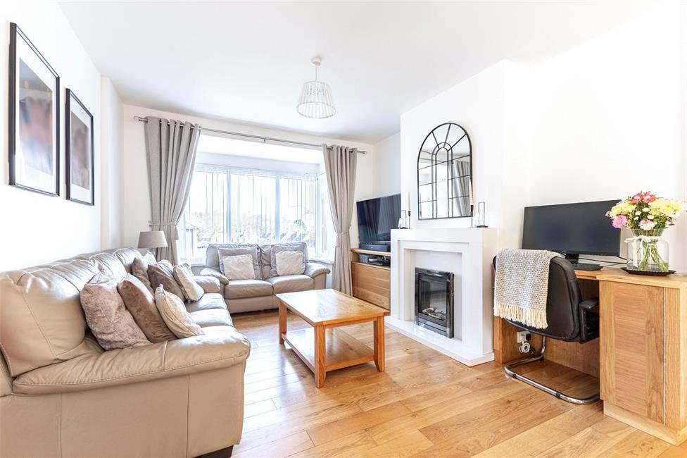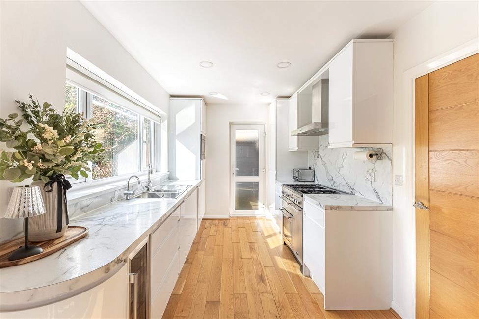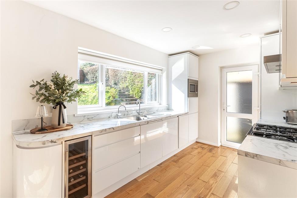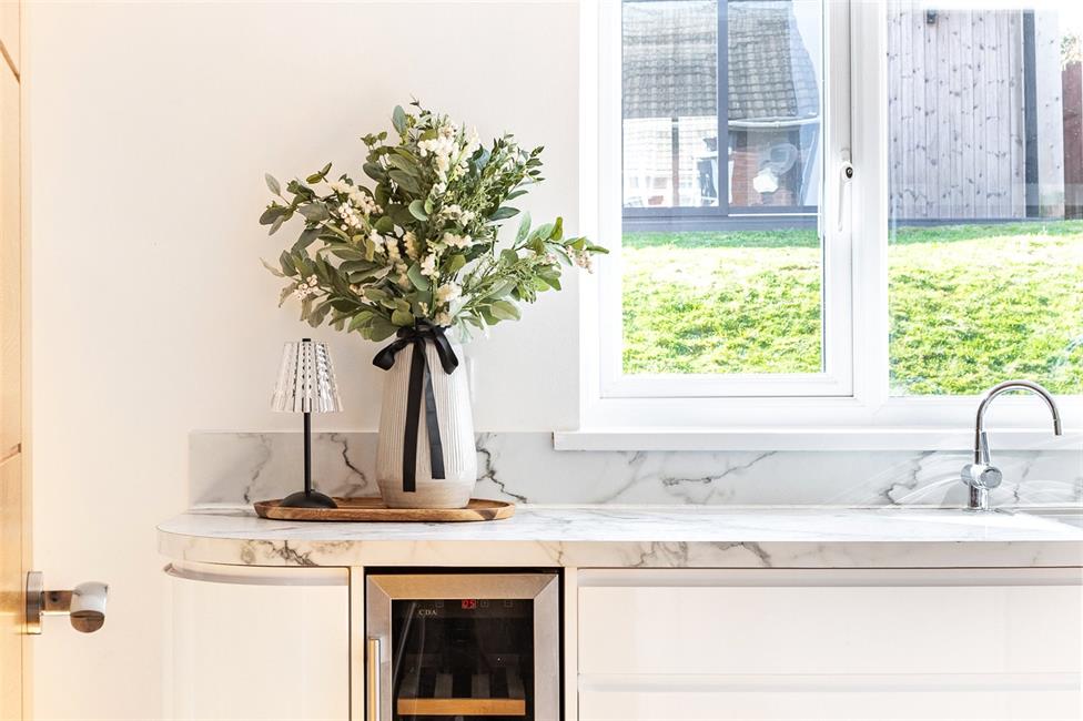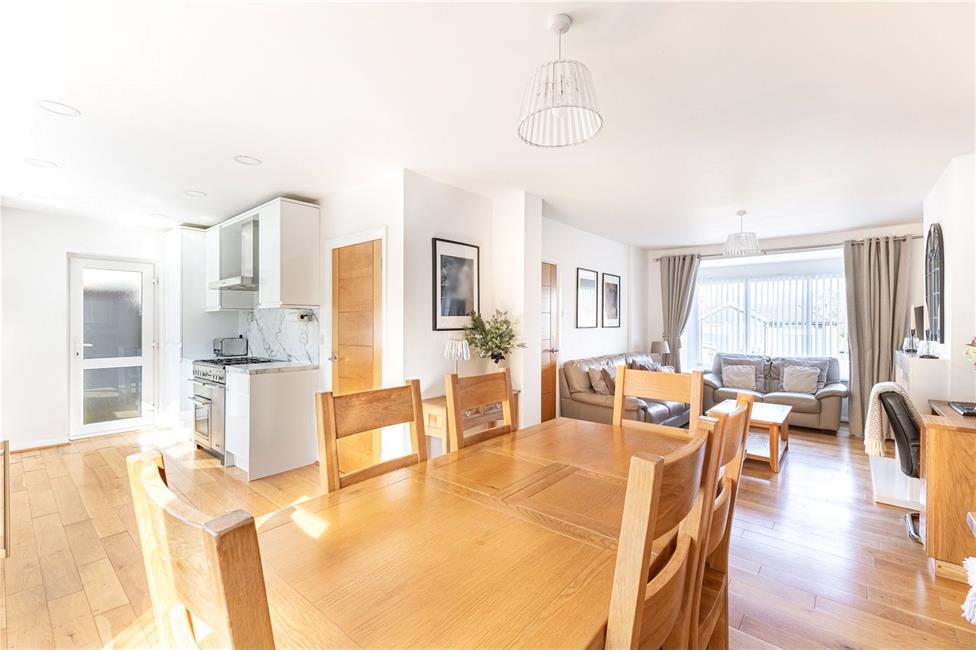 Beautiful and light open plan living space, comprising of a lounge with square bay window overlooking the large keyblock driveway, quality engineered wood flooring, contemporary stone fire surround with spotlights and electric fire, bespoke fitted desk and TV unit, radiator, opening to the dining area with radiator and ample space for a large family dining table, glazed French doors onto the rear patio. Modern kitchen appointed along two sides in white gloss fronted units beneath quality worktop surfaces, inset stainless steel one and a half bowl sink and drainer with mixer tap and Insinkerator hot and cold filtered tap, space for a range cooker, stainless steel cooker hood, integrated microwave/oven, integrated fridge and freezer, integrated dishwasher and wine cooler, matching range of eye level units, continuation of the engineered wood flooring, large inset spotlights, window overlooking the well-manicured rear garden with day/night roller blind, opaque glazed door to the side.