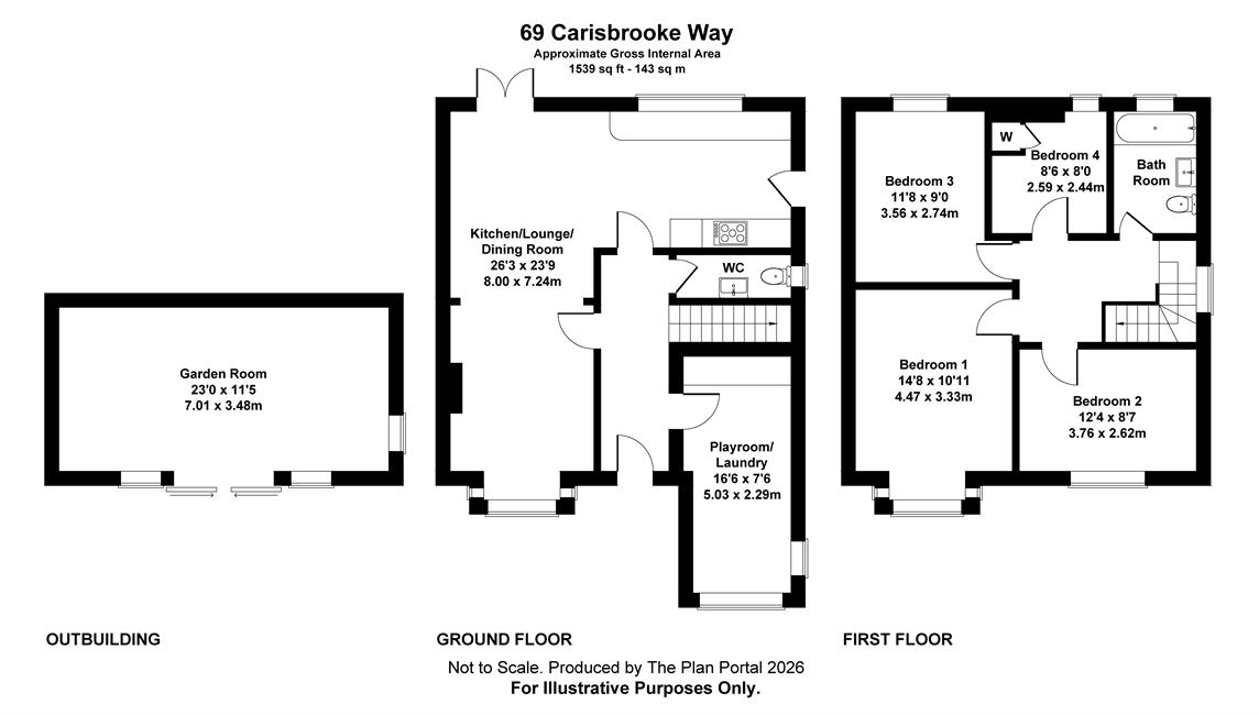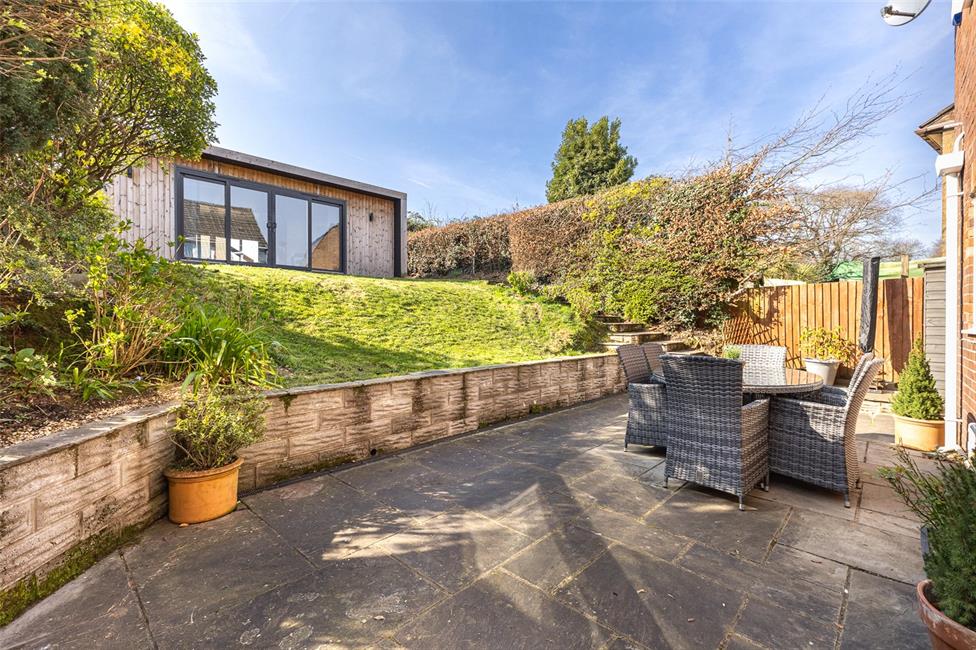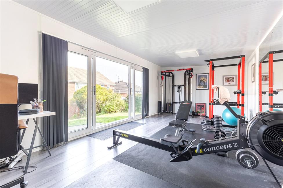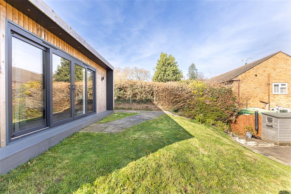 Open plan front with large keyblock driveway with parking for 3-4 cars, well tended lawned rear garden with large patio relaxation area and a superb 23ft versatile garden room with full height windows and sliding doors.