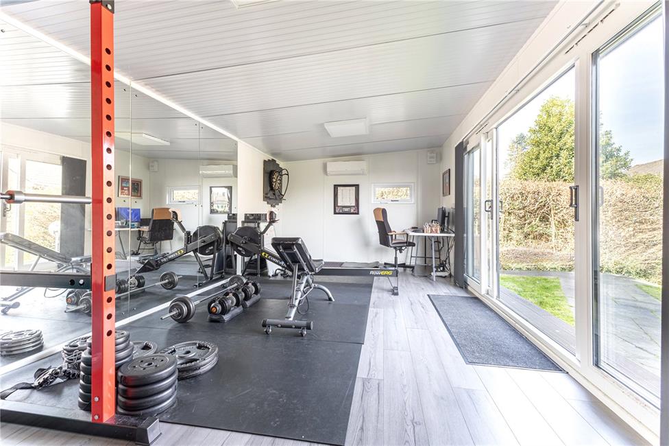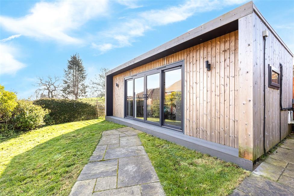 Contemporary timber cladded garden room with full height windows and sliding doors, outdoor mounted wall lights and downlighters, hardwired broadband, additional window to side, power points and lighting, wood grain effect flooring. Air conditioning unit.