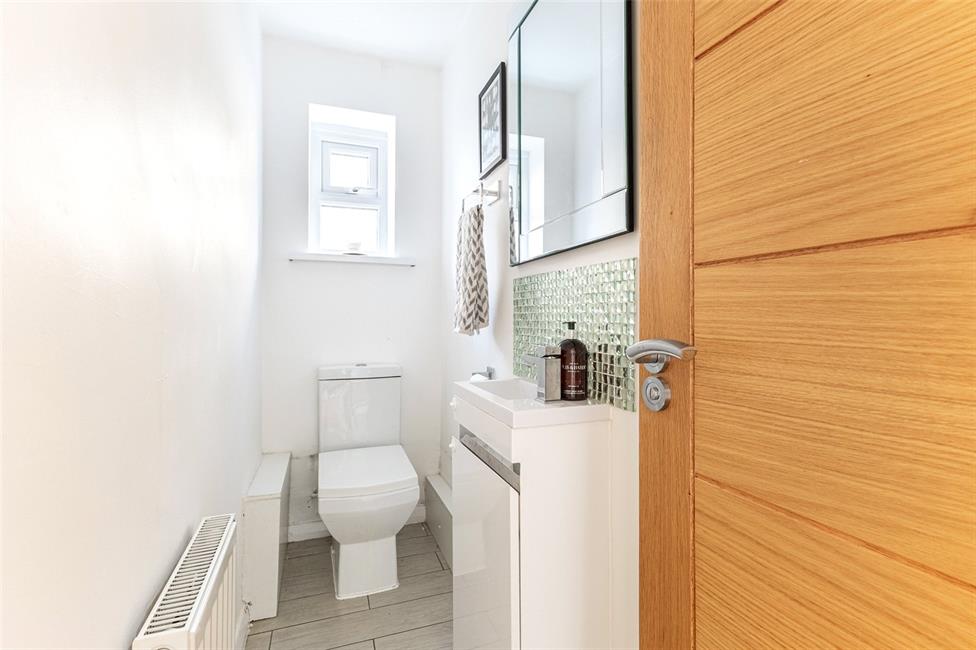 Modern white suite comprising low level WC with push button cistern, wash hand basin with mixer tap and storage cabinet below with tiled splashback, opaque window to side, radiator, quality tiled flooring.