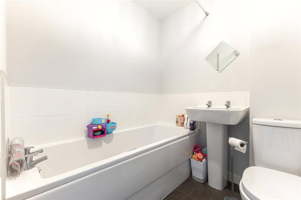 Modern white suite comprising low level WC with push button cistern, pedestal wash hand basin, panelled bath, ceramic wall tiling to wet areas, vinyl flooring, and radiator.