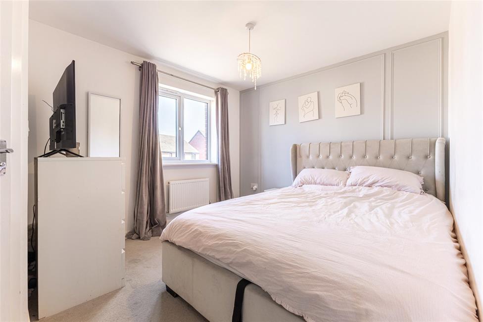 Window to front, feature panelled wall, built-in over stairs storage cupboard, door to ensuite shower room.