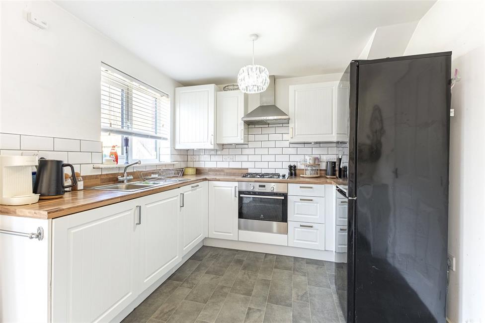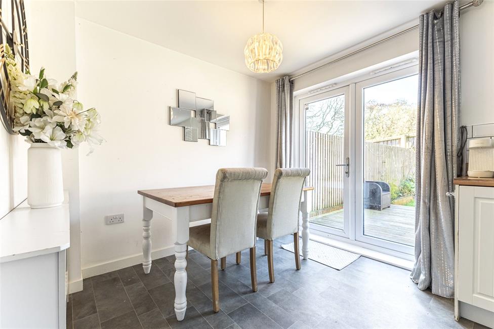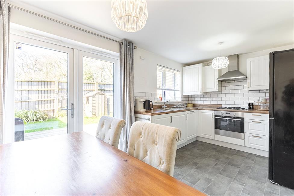 Appointed along three sides in white finished fronts beneath round nose worktops surfaces, inset stainless steel one and a half bowl sink and drainer with mixer tap, four ring gas hob with oven below and stainless steel cooker hood, matching range of eye level units, metro brick wall tiling to worktop surrounds, wall mounted gas central heating boiler behind a matching unit, space for upright fridge freezer, integrated washing machine, window to rear, vinyl flooring, radiator, ample space for dining table, UPVC French doors leading onto the lawned rear garden.