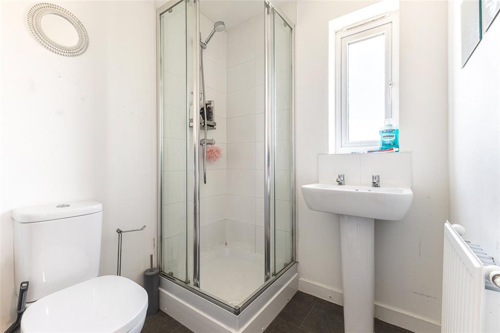 White modern suite comprising low level WC with push button cistern, pedestal wash hand basin with tiled splashback, glazed shower cubicle with thermostatic shower, vinyl floor covering, opaque window to front, radiator.
