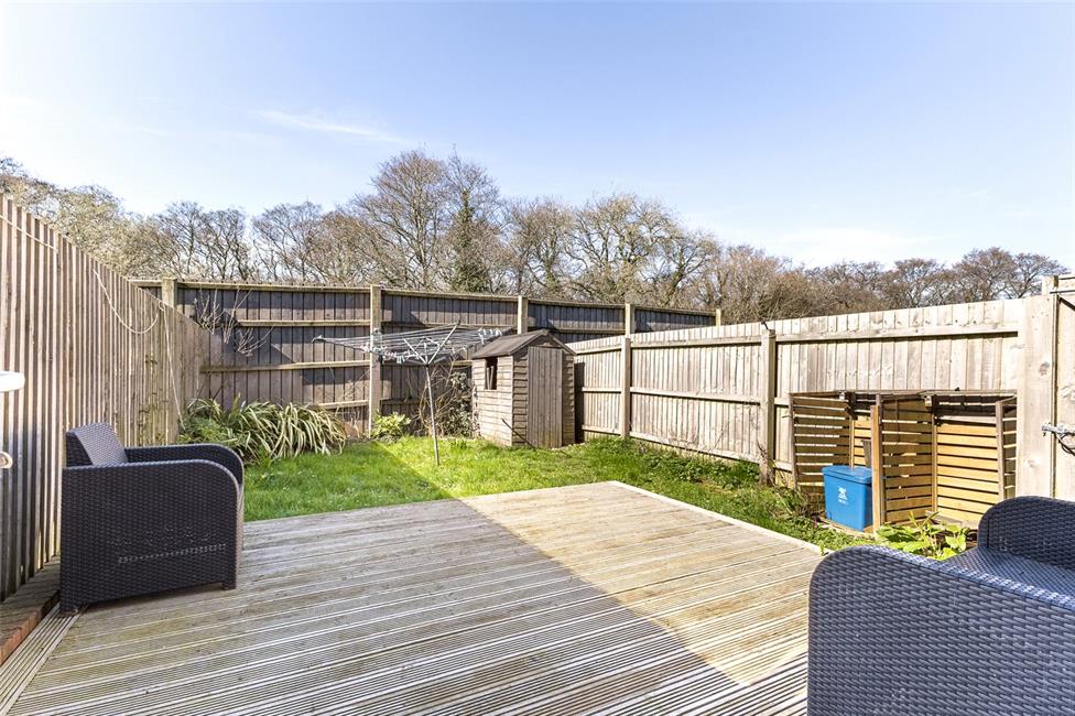 Decked patio area leading onto a section of lawn with shrub boarder, enclosed with timber lap fencing, timber garden shed.