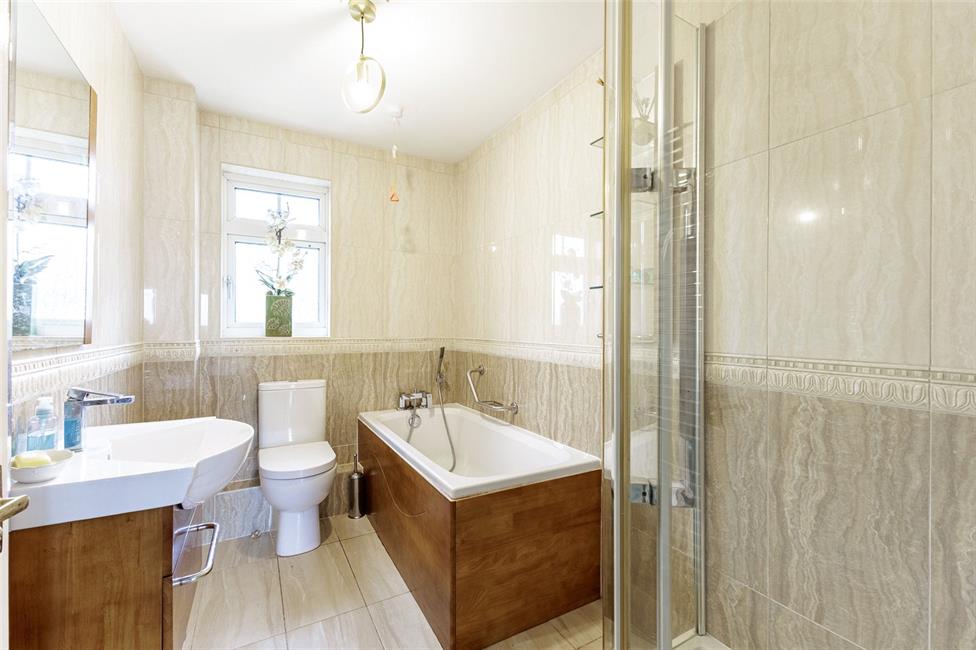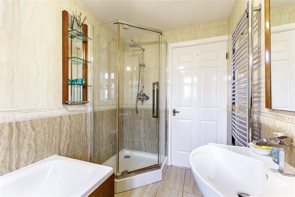 Panelled bath with hand held shower facility, low level WC, vanity wash basin with cabinet below, corner shower cubicle with shower head and glazed shower screen panels, chrome heated towel rail, pink ceramic wall tiling with border.