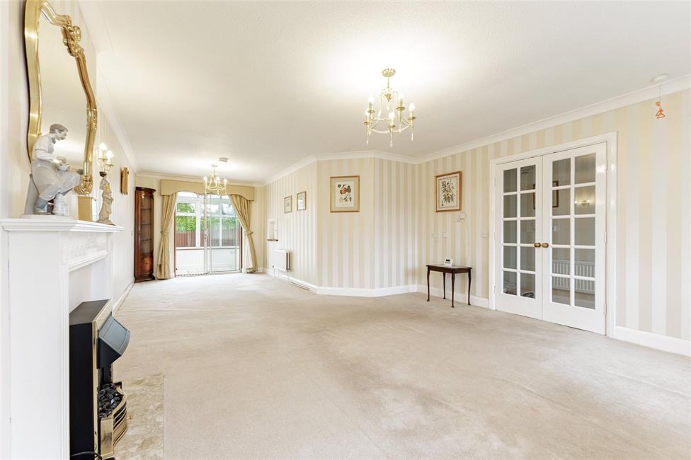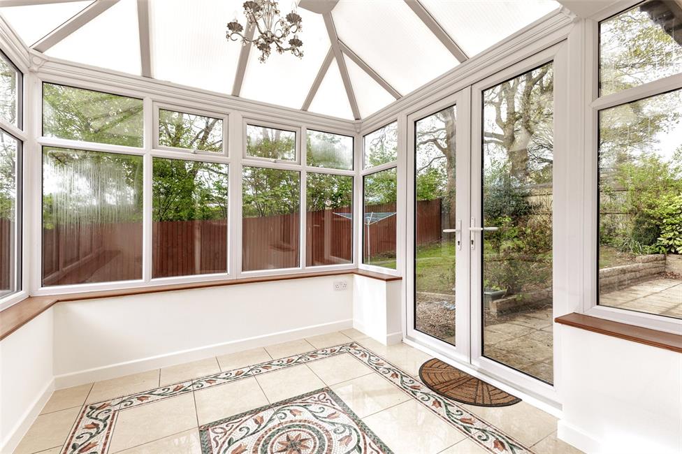 With double glazed units and double glazed French doors leading to the rear garden and patio, hipped roof covering, decorative tiled flooring with border.