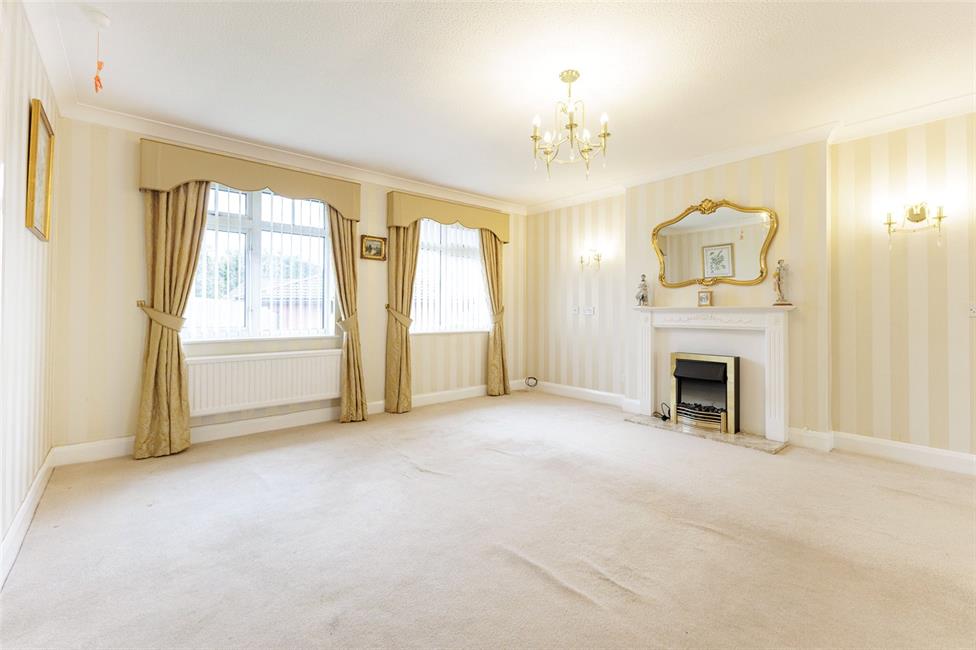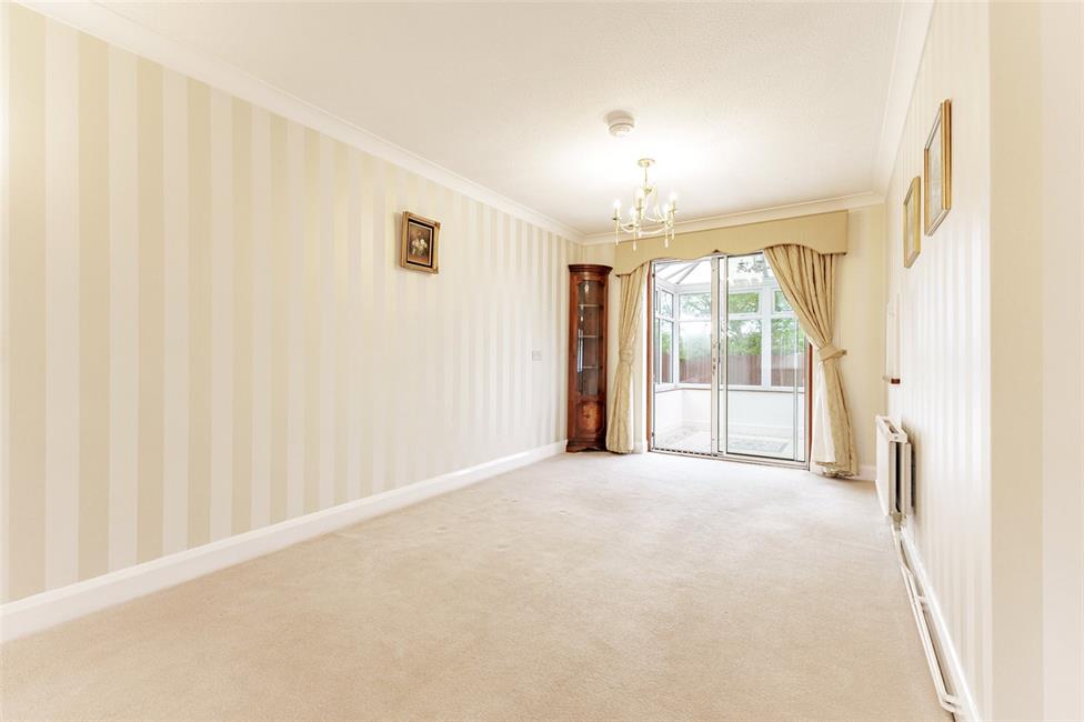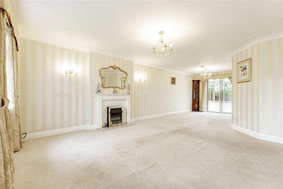 Overlooking the entrance approach with two large picture windows, two double panelled radiators, attractive fire surround with conglomerate marble hearth, electric fire, serving hatch to kitchen, double glazed sliding patio doors to conservatory. Small pane glazed twin doors returning to hall.