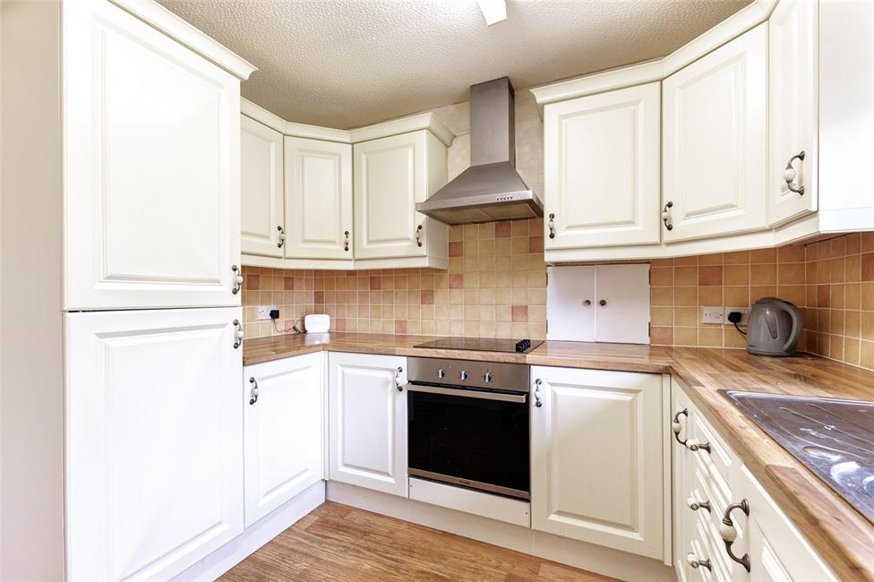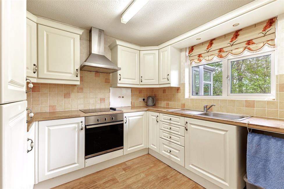 Fitted along three sides beneath round nosed worktop surfaces, inset four ring electric hob with circulating fan above, oven below, matching range of base and eye level wall cupboards with pelmets and borders, inset stainless steel sink and drainer with mixer tap, plumbed for automatic washing machine, ceramic wall tiling to worktop areas, integrated fridge with matching front, integrated freezer with matching front, pelmet window lighting, aspect to rear garden, double panelled radiator.