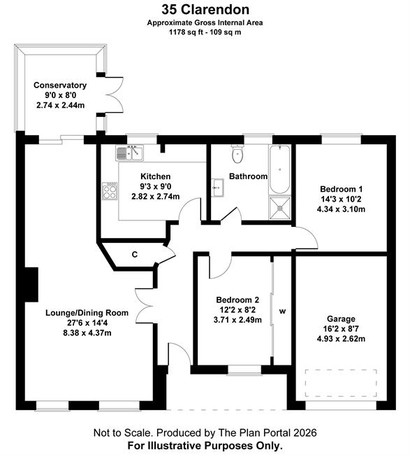 Central hall, 27ft lounge/diner, conservatory with French doors, fitted kitchen, 2 bedrooms, family bathroom with shower. Double glazed windows and gas central heating.