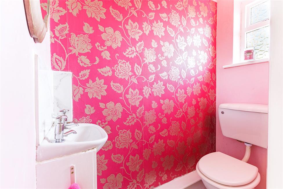 Low level WC, wash hand basin, timber casement window.