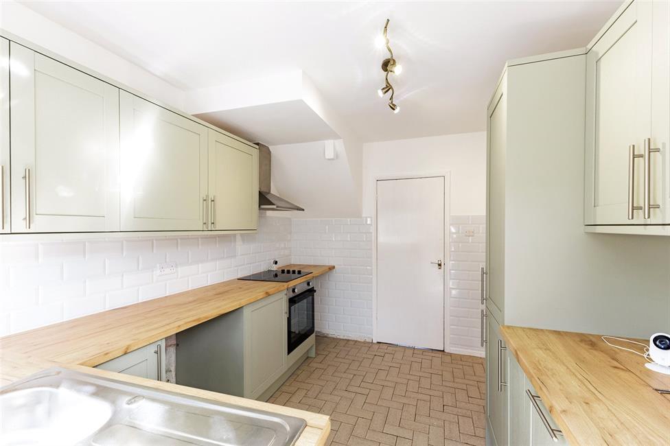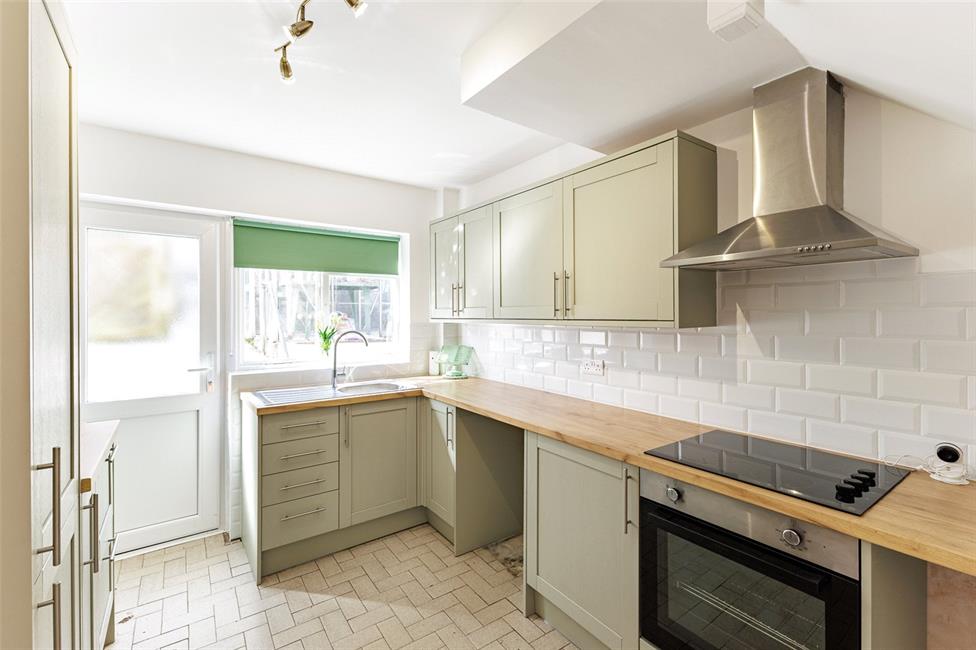 Well appointed along three sides beneath round nosed worktop surfaces, inset four ring electric hob with circulating fan above and oven below, matching range of base and eye level wall cupboards with pelmets and borders, plumbed for washing machine, inset stainless steel sink and drainer with mixer tap, double glazed door to side, matching dresser style unit with tall storage cupboard, timber casement window overlooking the rear garden, ceramic wall tiling to three quarter height, tiled flooring.
