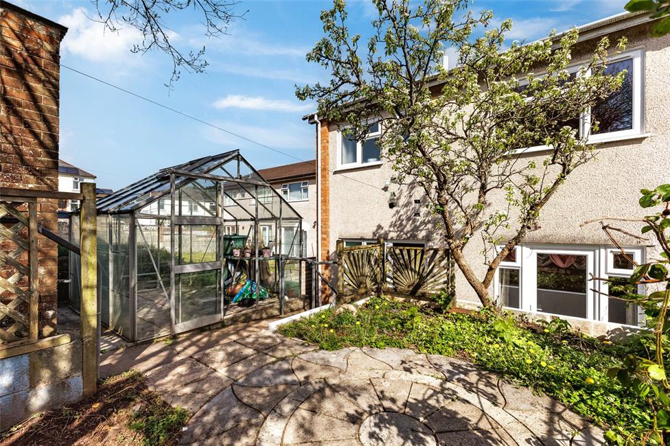 Attractive circular patio relaxation area with central pathway and steps leading to the far end and service lane. Aluminium greenhouse, outside water tap.