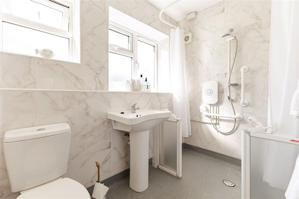 Modern wet room comprising low level WC, pedestal wash hand basin, large shower area with shower screen curtains, air extractor fan, ceramic wall tiling, heated towel rail.