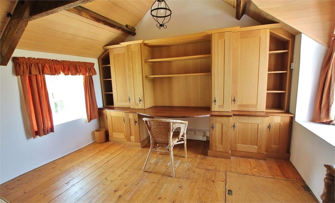 Windows to the front and rear, tall vaulted beamed ceiling, range of quality bespoke oak fitted office furniture with central work station, pelmet cover, natural floor boarding.