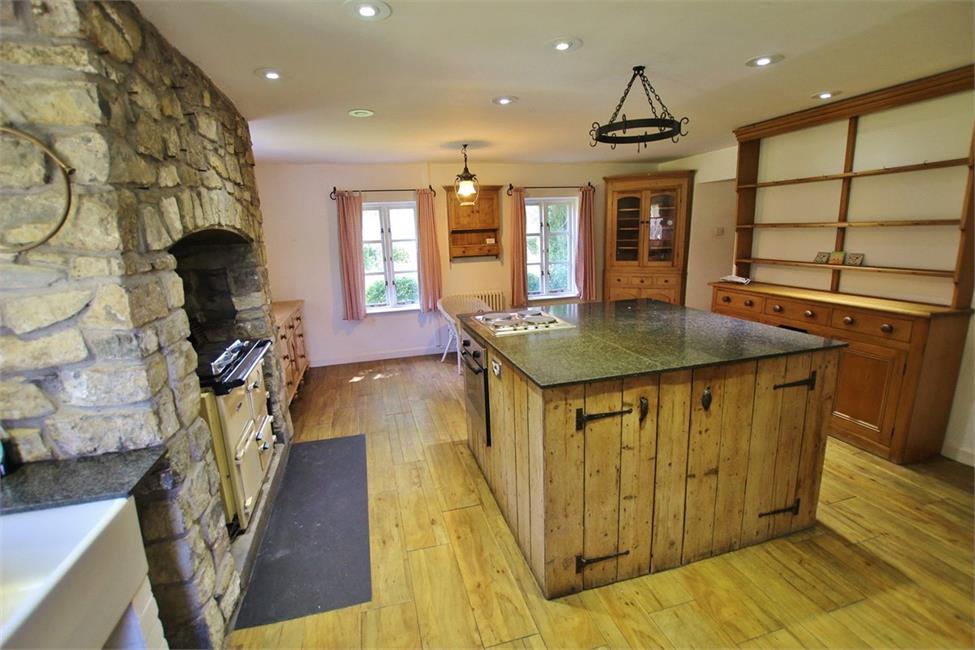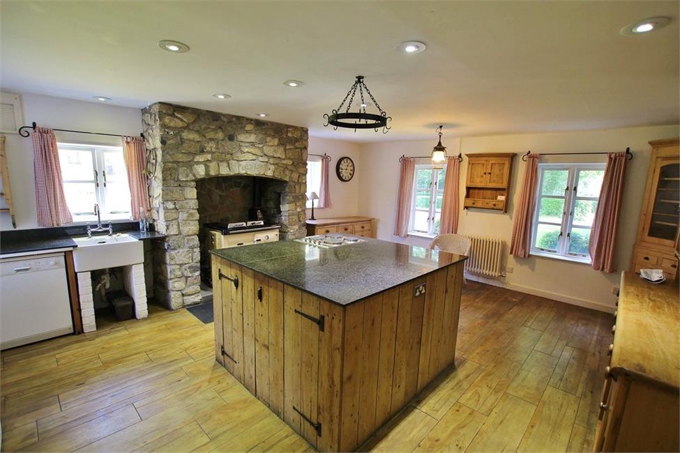 Feature central island with granite worktops, inset four-ring "Atag" electric hob with oven below, natural stone facing chimney breast with recess for Rayburn Nouvelle oil fired stove with hotplates, having the dual benefit of heating the domestic central heating, Belfast sink with chrome finish mixer tap, matching granite displays, plumbing for automatic dishwasher, windows to three elevations enjoying views to the ornamental garden, two tubular radiators. Amtico random plank elm quality floor finish.