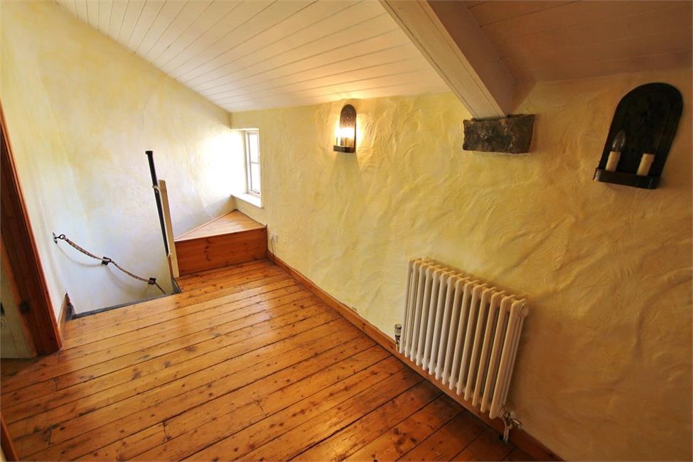 Approached by a wide easy rising single flight staircase leading onto a central landing area, vaulted ceiling, natural floor boarding, tubular radiator, secondary stone staircase to dining room, built-in pine panelled double linen cupboard housing hot water cylinder with shelving.
