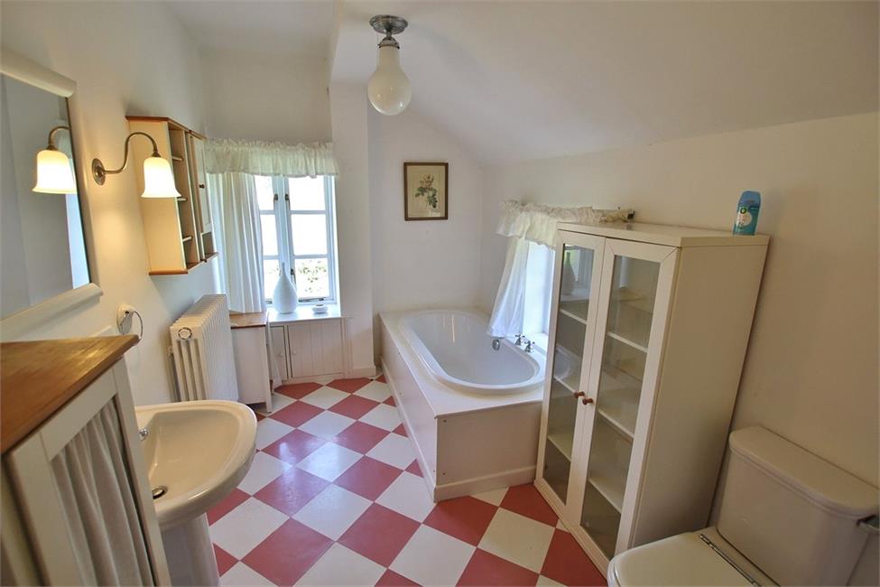 Quality suite in white comprising low level WC, pedestal wash hand basin, panelled bath, shower cubicle with shower, pivoting shower, tubular radiator, tongue-and-groove wall panelling to half height with matching floorboards.